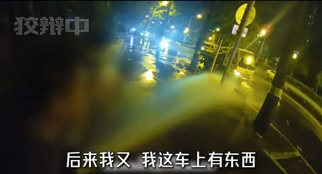 路边停着一辆蓄水车,嫌疑男子还在狡辩。