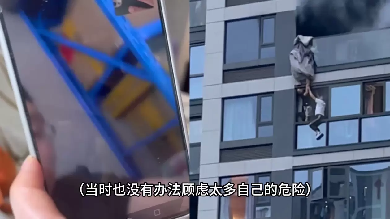 施救者 余先生:找半天都没找到一个合适的着力点,我只能让他的脚踩在我的肩膀上,光脚踩在我身上一滑一滑的。当时也没想那么多,应该也是一种本能的反应吧,开始就想把他救下,因为这楼层太高了。后来可能火势太大了,坚持不住了。