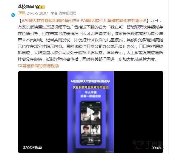 近日,有家长反映通过某短视频平台广告推送下载的名为“我在AI”智能聊天软件疑似存在色情引导,且在未实名注册情况下即可无障碍使用,该家长质疑这或将为青少年带来不良影响。记者实测发现,即使打开该软件的儿童模式,其预设的智能回复提示也存在部分性暗示内容。目前该软件开发公司办公地已停止办公,门口有牌匾被拆痕迹,天眼查显示该公司现处于股权出质状态。律师表示,人工智能发展应遵循社会公序良俗,抵制淫秽内容传播,同时有关部门需进一步加大执法监管力度。