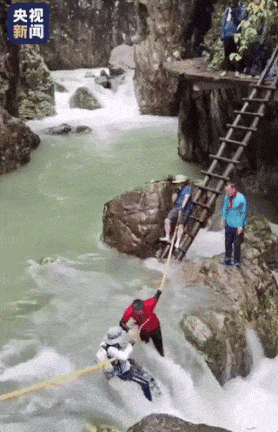 现场视频显示,横渡只有一根绳索,没有设置其他保护绳,导致两人站立不稳被冲进激流,形成非常难以救援的环境——“死亡V字流”。