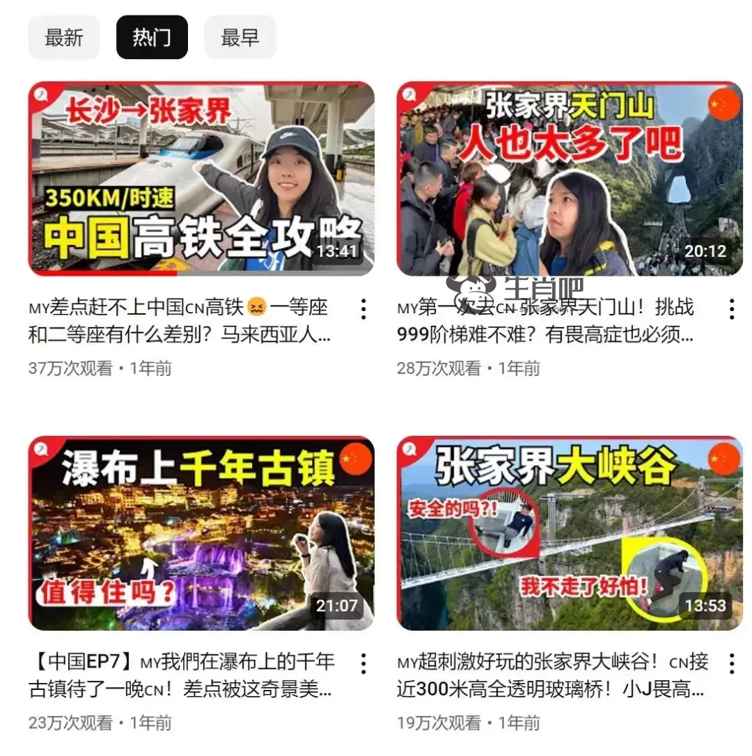 来自马来西亚的旅行情侣博主Jaguar和Janice也去过多个国家旅游,他们的热门视频里与中国旅游相关的占了一大半。其中一条名为“马来西亚人体验350KM/hr中国高铁”更是获得了37万的播放量。