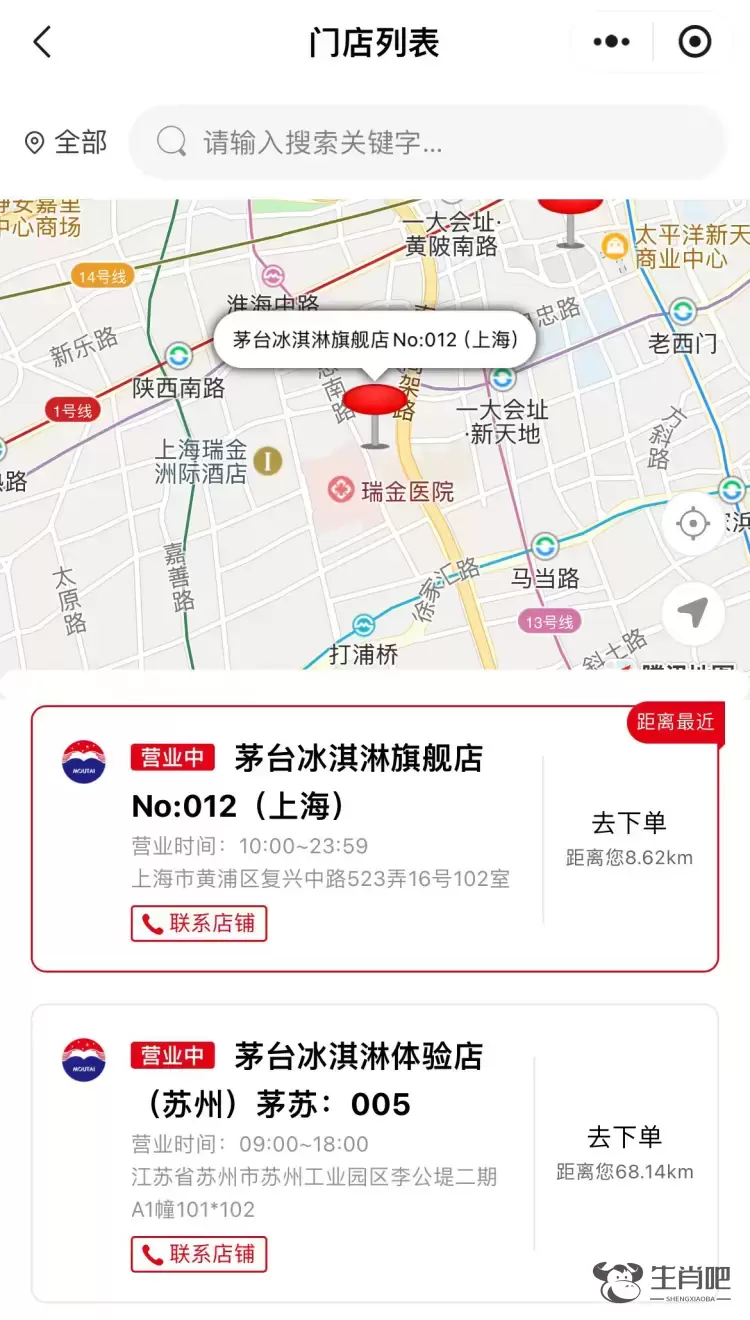 另外,小程序中只显示位于黄浦区复兴中路的茅台冰淇淋旗舰店。但是从地图软件搜索,能够看到在上海还有多家茅台冰淇淋的“体验店”,在南京东路和豫园还存在两家“快闪店”。