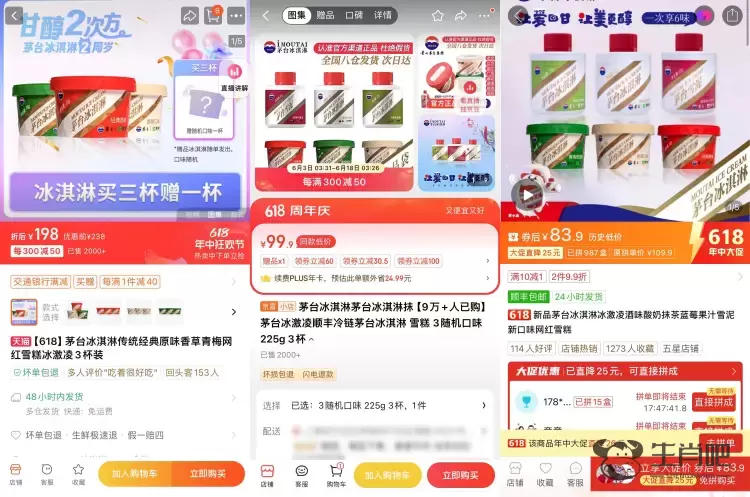 记者还注意到,茅台冰淇淋在各大网购平台上的价格也与实体店大有出入。临近618大促,淘宝的官方店的平均单价在四十元左右,京东的第三方店价格基本在三十元左右,拼多多部分第三方店的平均单价更是低至二十六元每支。