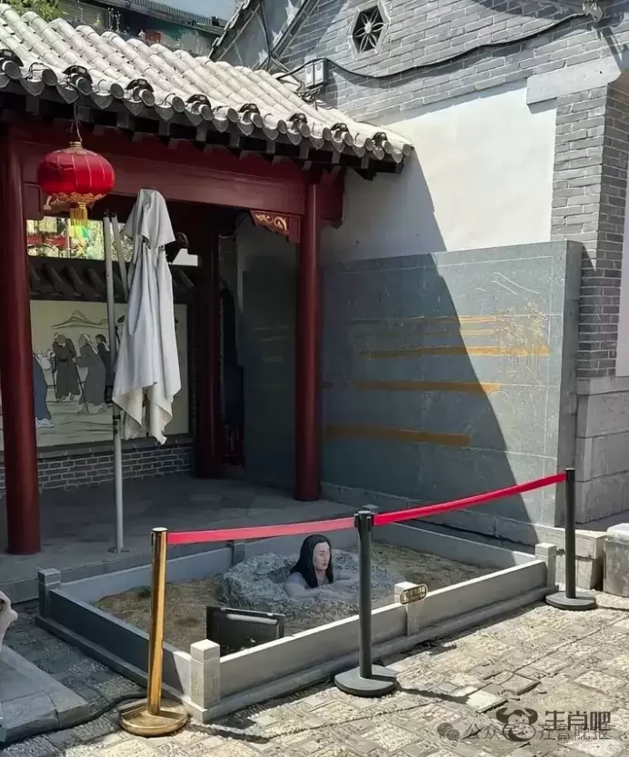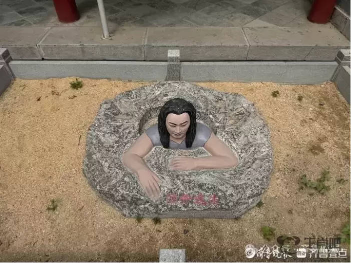 6月5日,记者在宽厚里的舜祠找到了这块雕像,如游客描述,在进入正门西边的角落,有一处“人从井里爬出”的雕像,旁边配有一盏射灯。除了井口边写着“侧井逃出”,没有任何有关这处雕像的介绍。