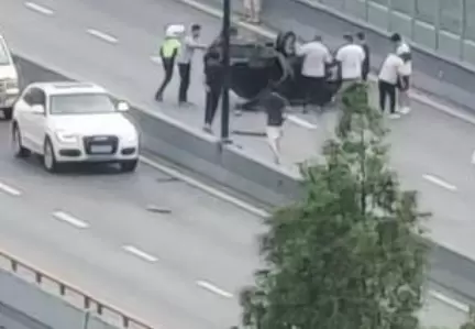 事情发生在昨天下午3点不到,中河高架北向南庆春路下口,一辆轿车因司机操作不慎发生翻倒,四脚朝天躺在地上。