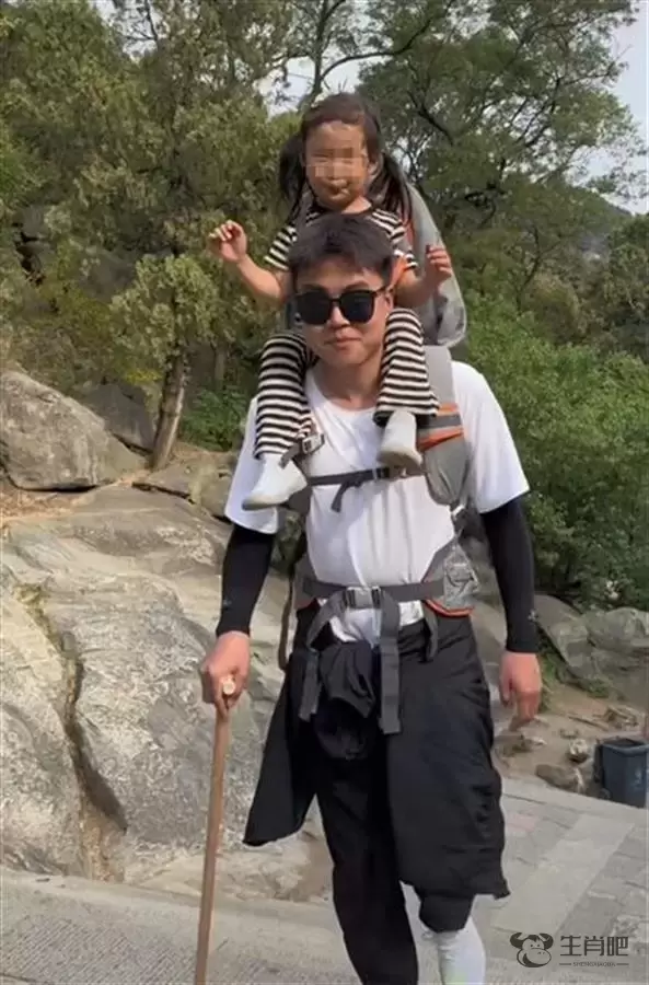 在路人拍摄的视频中,一名年轻小伙戴着墨镜,背着一个小女孩,一步两级台阶,步伐轻盈地往上登山。下山的路人,一个个都向其投去惊讶的目光和表情。