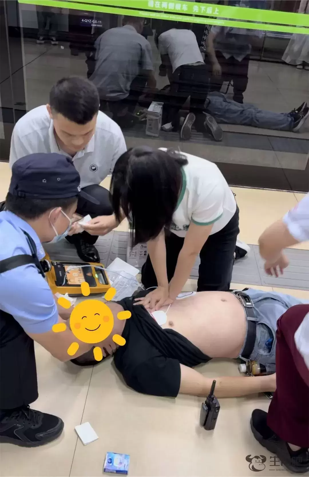 随后,她解开男子上衣,开始徒手心肺复苏,同时请地铁工作人员赶紧取来自动体外除颤仪(AED)。持续几轮电除颤和心肺复苏过程中,在场的路过行人也帮助筋疲力尽的詹少萍,轮流对男子心肺复苏,詹少萍则在一旁指导。