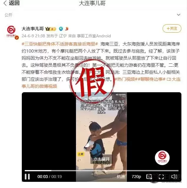 对此,三亚市公安局等部门传唤企业法人代表、摩托艇驾驶员进行询问,并联系母子二人了解情况。调查结果显示,当事母子二人中母亲晕船自愿下艇,摩托艇驾驶员便临时将其放置在水深不到脚踝的地方。据了解,摩托艇驾驶员并未离开,而是等待接应救援队人员将母子二人带上岸,并非网传视频所称的将游客扔在海里不管,请广大网民不信谣、不传谣。