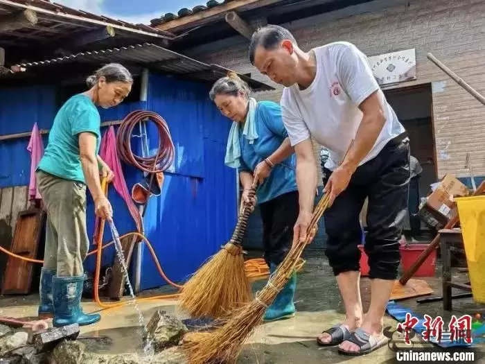 杨再智(右一)和村民铲除淤泥、清洗地面。蒲湘萍摄
