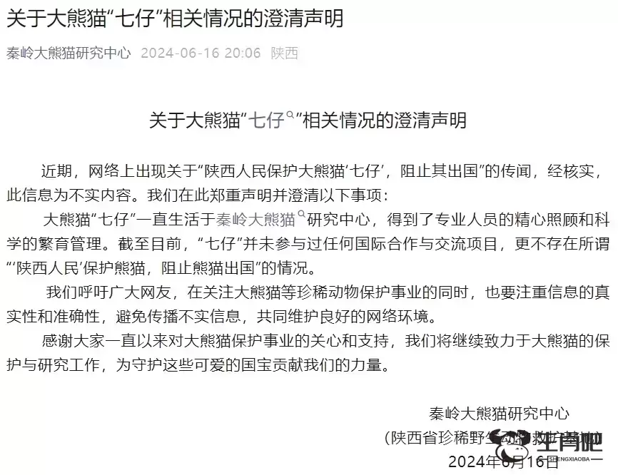 6月16日晚,“秦岭大熊猫研究中心”微信公众号发布《关于大熊猫“七仔”相关情况的澄清声明》,声明表示,近期,网络上出现关于“陕西人民保护大熊猫‘七仔’,阻止其出国”的传闻,经核实,此信息为不实内容。
