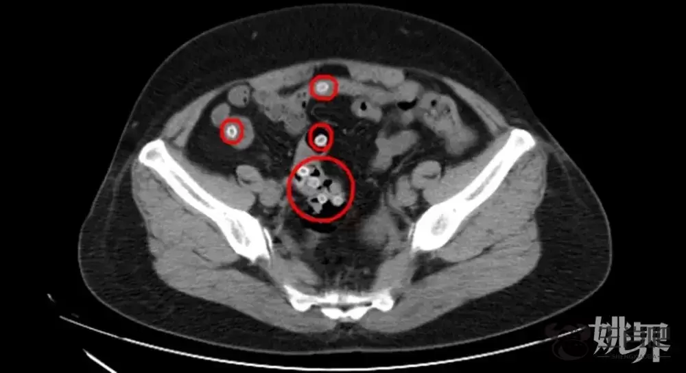 CT影像显示,王阿姨的肠内存在多处类圆形高密度影,密密麻麻的圆圆小白点正是滞留在肠道内的杨梅核,这是导致患者腹痛不止的罪魁祸首。