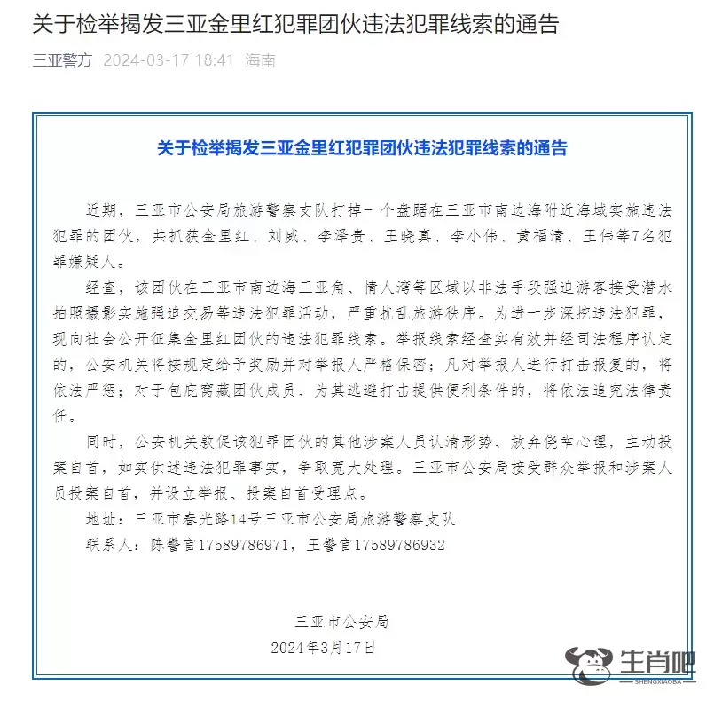 此前,有不少游客反映,自己去三亚潜水时曾被强迫推销拍照,“他们把一起潜水的游客分开,在水中摘下游客的潜水面罩问要不要拍照,我们很害怕只好答应。”3月17日,海南三亚警方发布的一则“关于检举揭发三亚金里红犯罪团伙违法犯罪线索的通告”,通告称,该团伙在三亚市南边海三亚角、情人湾等区域,以非法手段强迫游客接受潜水拍照摄影实施强迫交易等违法犯罪活动,严重扰乱旅游秩序。