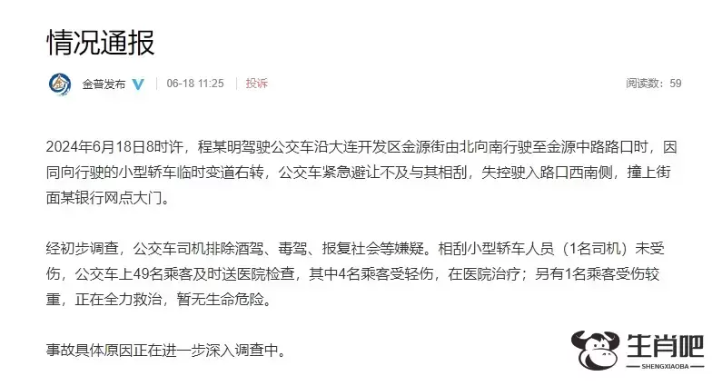 2024年6月18日8时许,程某明驾驶公交车沿大连开发区金源街由北向南行驶至金源中路路口时,因同向行驶的小型轿车临时变道右转,公交车紧急避让不及与其相刮,失控驶入路口西南侧,撞上街面某银行网点大门。