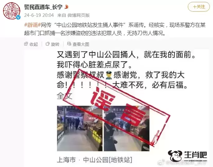 上海市长宁公安分局官方微博消息,网传“中山公园地铁站发生捅人事件”系谣传。经核实,现场系警方在某超市门口抓捕一名涉嫌盗窃的违法犯罪人员,无持刀伤人情况。