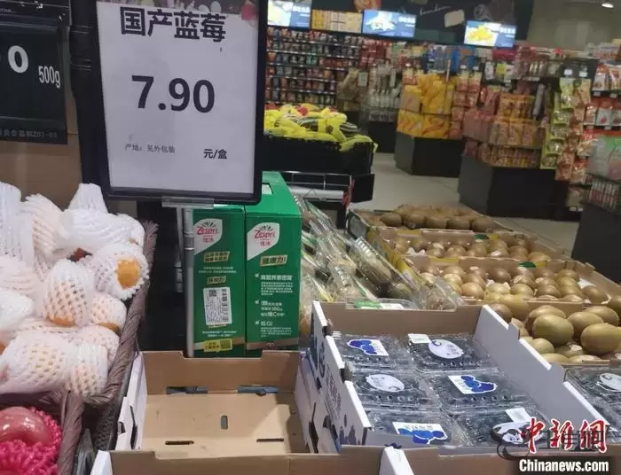 近日,中新财经记者在某超市注意到,125克的国产蓝莓降至7.9元,相较此前动辄10多元一盒(125克)的蓝莓价格便宜不少。但进口蓝莓价格仍保持在较高价位。