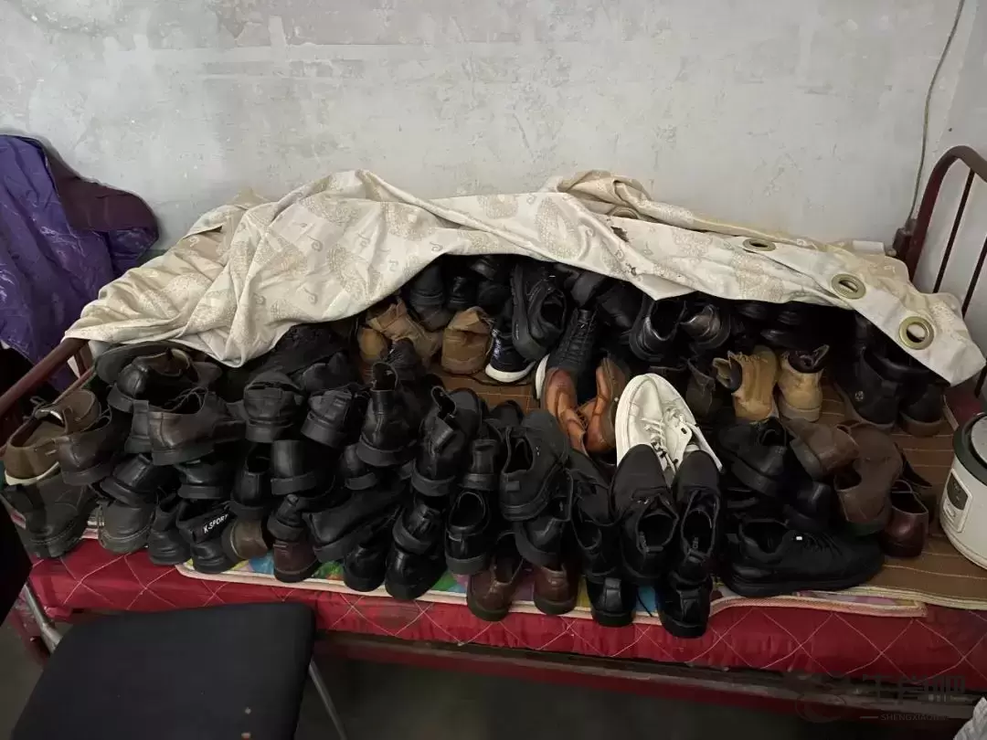 犯罪嫌疑人家中堆积的旧皮鞋。