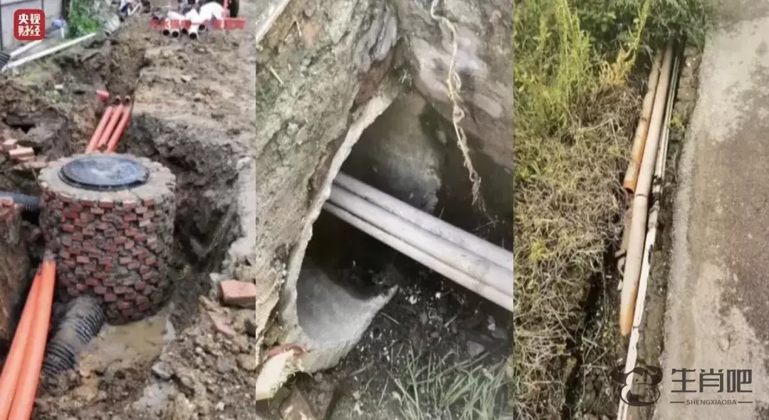 从当初施工期间村民拍摄的照片可以看到,红色的强电线缆直接被砌进了污水井,白色的弱电线缆被随意插进了水泥制成的雨水管道内,还有一些强弱线缆被随意掩埋在排水渠内。