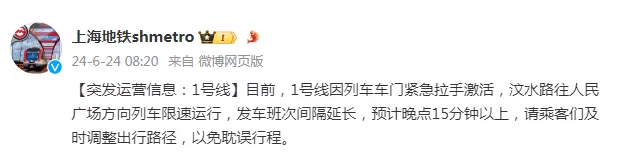 1号线因列车车门紧急拉手激活,汶水路往人民广场方向列车限速运行,发车班次间隔延长,预计晚点15分钟以上。
