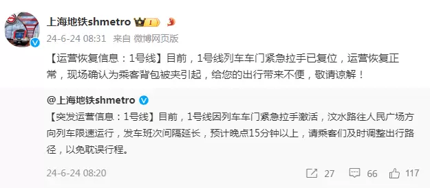 8点31分,@上海地铁shmetro 发布运营恢复信息,目前,1号线列车车门紧急拉手已复位,运营恢复正常,现场确认为乘客背包被夹引起,给您的出行带来不便,敬请谅解!
