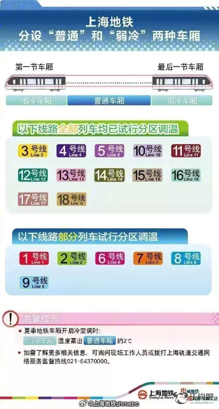 上海地铁自2021年起试行夏季“分区调温”,除1、2、6、7、8、9号线部分列车外,其余列车设置头尾车厢为弱冷车厢。夏季地铁车厢开启冷空调时:弱冷车厢温度高出普通车厢约2度。