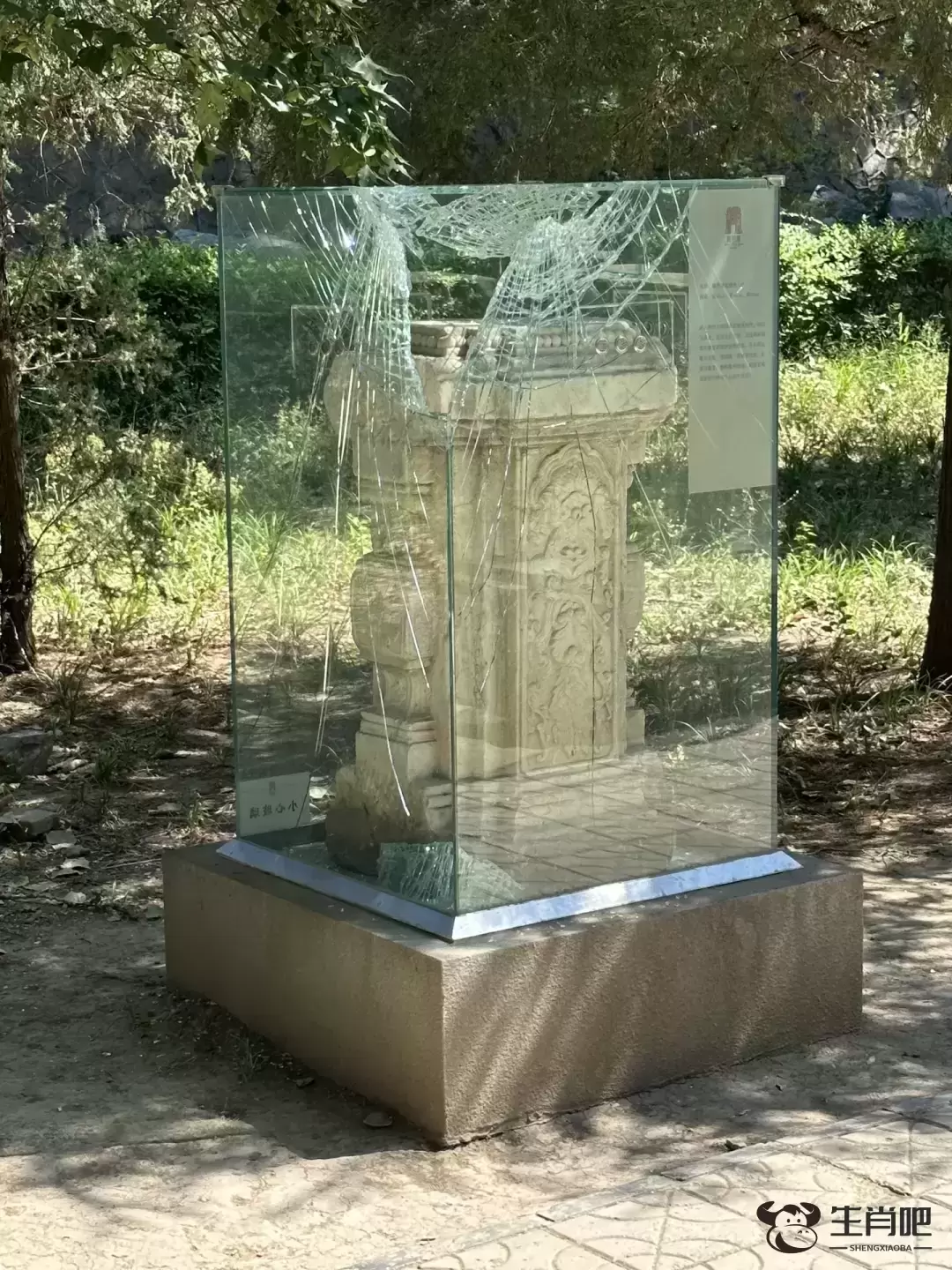 在圆明园西洋楼遗址内,一件汉白玉构件外的玻璃保护罩被砸裂了,路过的游客看后都很担心文物受损。对此,公园方面表示:玻璃罩破损系树木倒伏所致,目前正在研究修复更换。