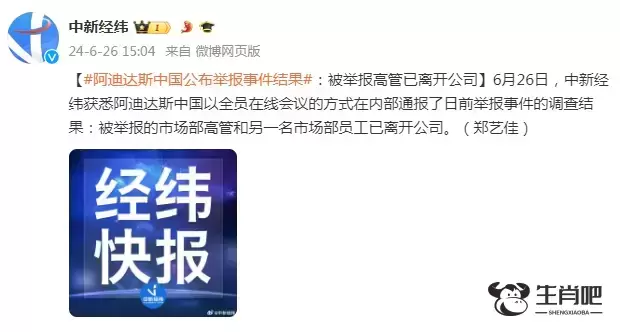 6月26日,中新经纬获悉阿迪达斯中国以全员在线会议的方式在内部通报了日前举报事件的调查结果:被举报的市场部高管和另一名市场部员工已离开公司。