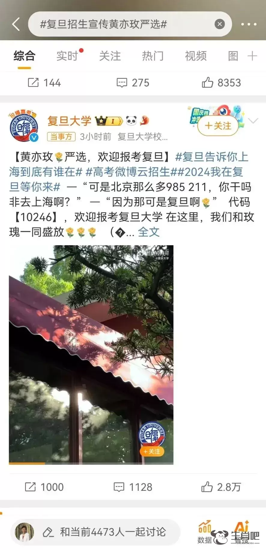 26日上午,复旦大学官方微博再次发文,称复旦大学是“黄亦玫严选,欢迎报考复旦”。随后,#复旦大学招生宣传黄亦玫严选#登上热搜。