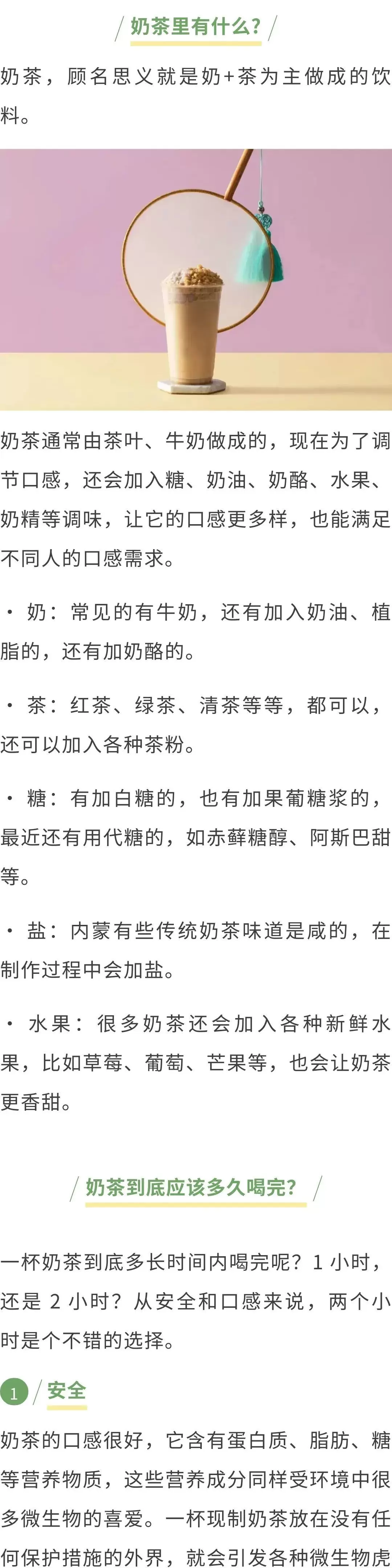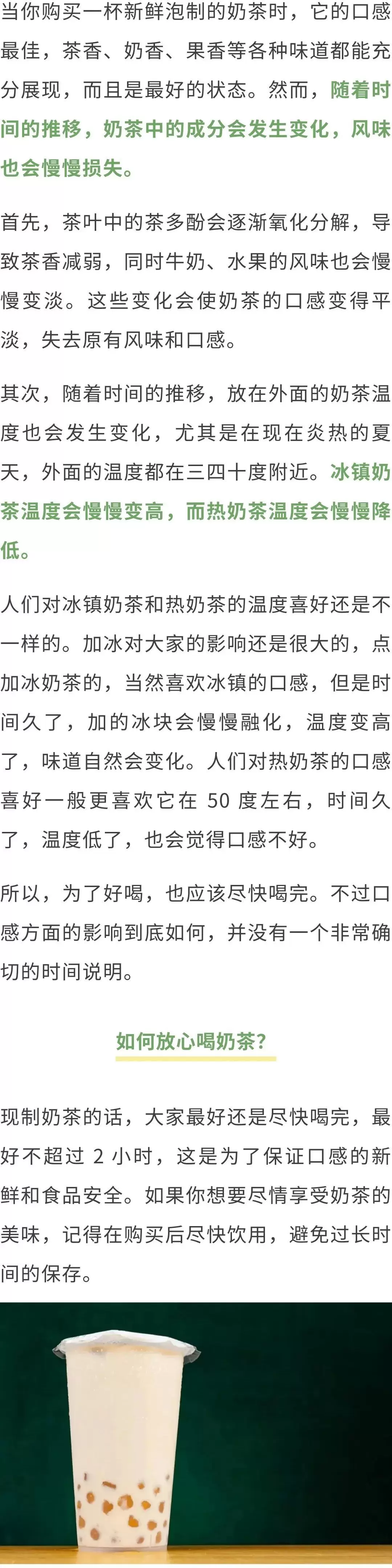 经常买奶茶的人肯定看到过很多奶茶包装上印有“请尽快饮用”“2小时之内饮用”“1小时内饮用完毕”等字样,有些店员也会提醒“尽快饮用,否则影响口感”。