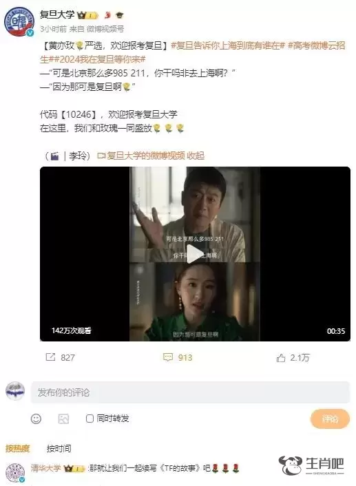 6月26日上午,复旦大学官博发布“黄亦玫严选,欢迎报考复旦”的相关视频写道:“代码10246,欢迎报考复旦大学,在这里,我们和玫瑰一同盛放。”清华大学官博随后回复:“那就让我们一起续写《TF的故事》吧。”