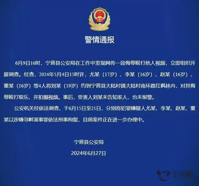 6月9日16时,宁晋县公安局在工作中发现网传一段侮辱殴打他人视频,立即组织开展调查。经查,2024年5月4日15时许,尤某(17岁)、李某(16岁)、赵某(16岁)、董某(16岁)等4人将刘某(19岁)约到宁晋县大陆村镇大陆村南环路红枫林内,对其侮辱殴打取乐,并拍摄视频。事后,受害人刘某未告知家人,也未报警。