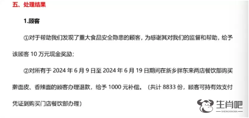 关于顾客,胖东来给予帮助其发现重大食品安全隐患的顾客10万元现金奖励;对所有于6月9日至6月19日期间,在新乡胖东来两店餐饮部购买擀面皮、香辣面的顾客办理退款,给予1000元补偿,共计8833份,共计补偿金额833.3万元。