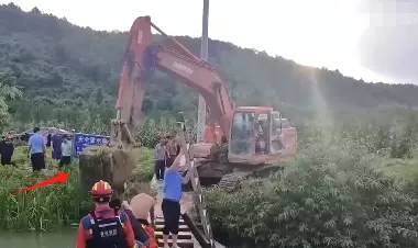 随后,现场救援人员商讨决定调集一台挖掘机,在堤坝上凿开一个口子以排水减压的方式降低排水口吸力,挖掘机作业时,救援人员也一直在水中拉拽着男子。