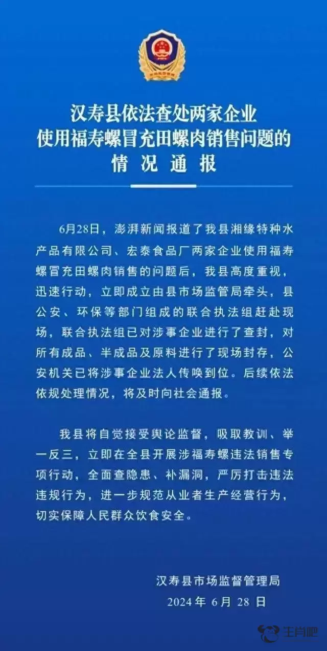 6月28日,澎湃新闻报道了汉寿县湘缘特种水产品有限公司、宏泰食品厂两家企业使用福寿螺冒充田螺肉销售的问题后,汉寿县高度重视,迅速行动,立即成立由县市场监管局牵头,县公安、环保等部门组成的联合执法组赶赴现场,联合执法组已对涉事企业进行了查封,对所有成品、半成品及原料进行了现场封存,公安机关已将涉事企业法人传唤到位 。后续依法依规处理情况,将及时向社会通报。