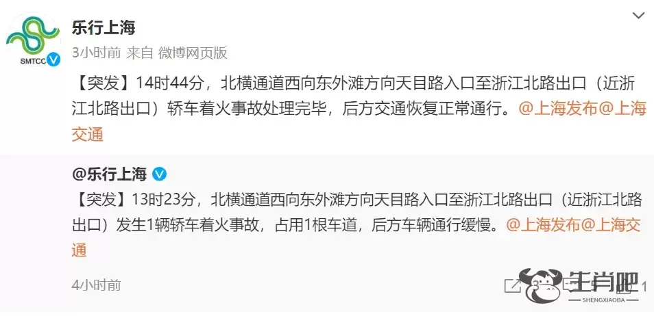 14时44分,北横通道西向东外滩方向天目路入口至浙江北路出口(近浙江北路出口)轿车着火事故处理完毕,后方交通恢复正常通行。