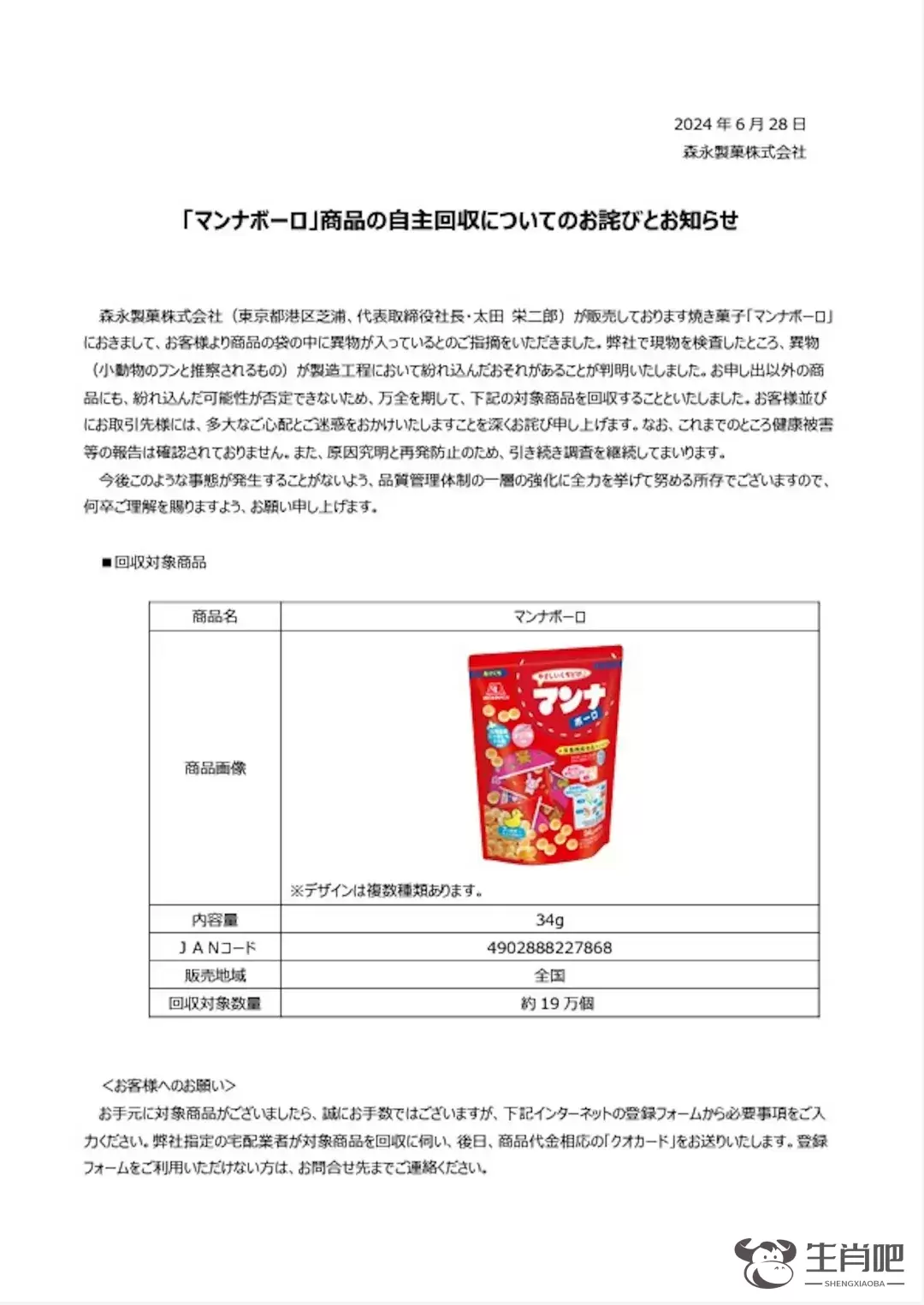 综合台媒和港媒报道,日本知名零食“森永小馒头”被曝丑闻,6月28日起主动回收约19万件产品。