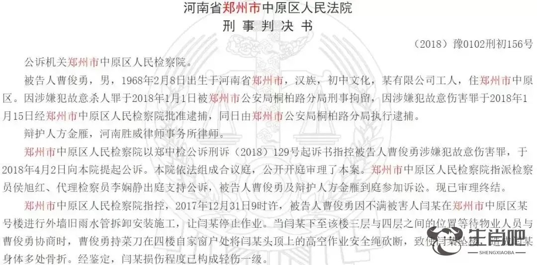 2017年12月31日9时许,被告人曹某某因不满被害人闫某在郑州市中原区某号楼进行外墙旧水管拆卸安装施工,让闫某停止作业。在闫某下至该楼三层与四层之间的位置等待物业人员前来与曹某某协商时,曹某某持菜刀在四楼自家卫生间窗户处将闫某头顶上的高空作业安全绳砍断,致使闫某坠楼,造成闫某身体多处骨折。