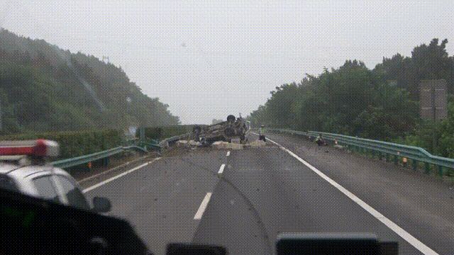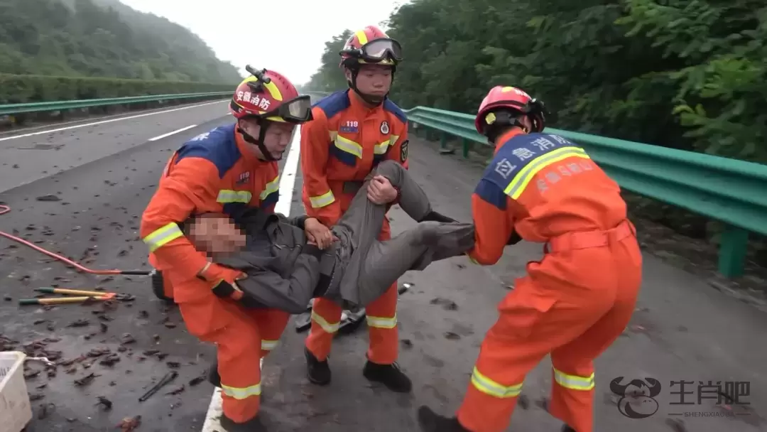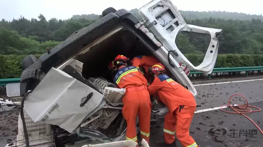 到场后消防员了解到,现场为一辆装载小龙虾的面包车撞上护栏,车辆侧翻严重,车内载有两名人员,驾驶员前期已被救出抬到路边,但仍有一名男子被困车内。