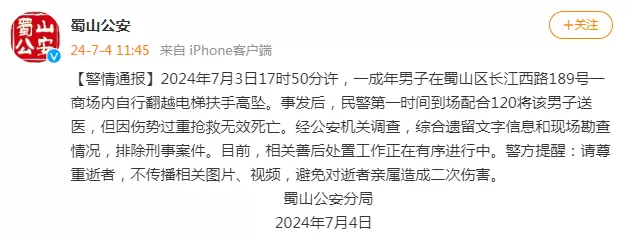 【警情通报】2024年7月3日17时50分许,一成年男子在蜀山区长江西路189号一商场内自行翻越电梯扶手高坠。事发后,民警第一时间到场配合120将该男子送医,但因伤势过重抢救无效死亡。经公安机关调查,综合遗留文字信息和现场勘查情况,排除刑事案件。目前,相关善后处置工作正在有序进行中。警方提醒:请尊重逝者,不传播相关图片、视频,避免对逝者亲属造成二次伤害。