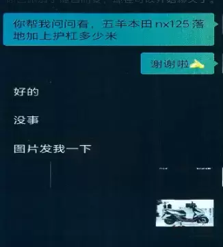 阿辉激动地加了小周的微信,还把自己感兴趣的摩托车型号、色号都发了过去。