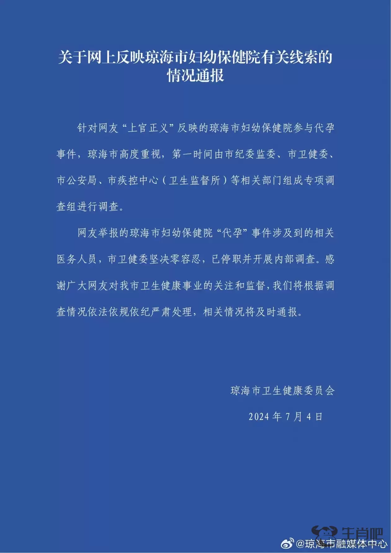 海南琼海卫健委通报“市妇幼保健院涉嫌参与代孕”:相关人员已停职并开展内部调查 2024 年 7 月 4 日 下午5:24 • 新闻快报 • 阅读 0 琼海市卫生健康委员会发布关于网上反映琼海市妇幼保健院有关线索的情况通报。 琼海市卫生健康委员会关于网上反映琼海市妇幼保健院有关线索的情况通报: 原创文章,作者:admin,如若转载,请注明出处:https://mip.shengxiaoba.com/news/37452.html 代孕停职卫健委妇幼保健情况通报涉嫌琼海琼海市通报 0 价格持续下跌!有人扛不住一次性割肉卖出,直亏10万!宁波有人却想趁机囤货…… 上一篇 2024 年 7 月 4 日 下午4:34 受限专业怎么筛人?亚琛工大公开了… 下一篇 2024 年 7 月 4 日 下午7:51 相关推荐 3名初一男生从上海骑行到杭州!家长回应 2024 年 7 月 14 日 男子通过网游“低价代充”助电诈团伙洗钱128万元,被刑拘 2024 年 6 月 12 日 危险!2名男子沉迷钓鱼忽视泄洪警报,差点被冲没,若不慎溺水,如何自救? 2024 年 7 月 19 日 山洪来袭 湖南靖州一村支书40余分钟背出7位老人 2024 年 6 月 16 日 “神器”来了!专门抓拍这种车!柳州已有百余辆落网 2024 年 8 月 28 日 老人突发脑梗,交警上演“生死时速” 2024 年 9 月 12 日 一张货物单牵出黑色产业链……天津公安成功抓获产销假冒品牌机油犯罪团伙 2024 年 7 月 31 日 体能训练,从1岁半抓起? 2024 年 7 月 22 日 西湖边又一位大爷火了!有人为了他退票、改签!“这事,全看缘分” 2024 年 7 月 22 日 黄金大“截”案:购460克黄金寄陌生人,民警争分夺秒千里追回 2024 年 8 月 30 日