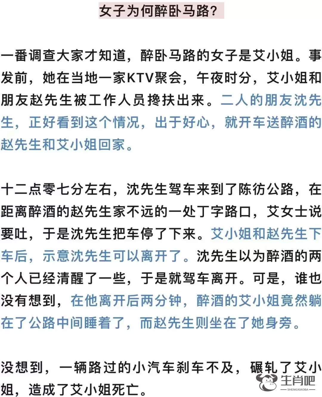 交警对于艾小姐被撞事故进行了调查后认定,死者艾小姐负主要责任,撞人的驾驶员车速过快,负次要责任,沈先生跟事故无关。但是死者家属追究完肇事驾驶员责任,获得了百万元赔偿后,转身一纸诉状,把沈先生也给告了。和他一起坐在被告席上的,还有KTV公司代理人。艾小姐家属向两被告共同索赔75万多元。