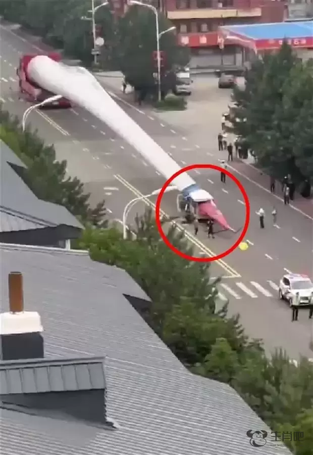 风力扇叶尖部刺穿一辆面包车(现场视频截图)