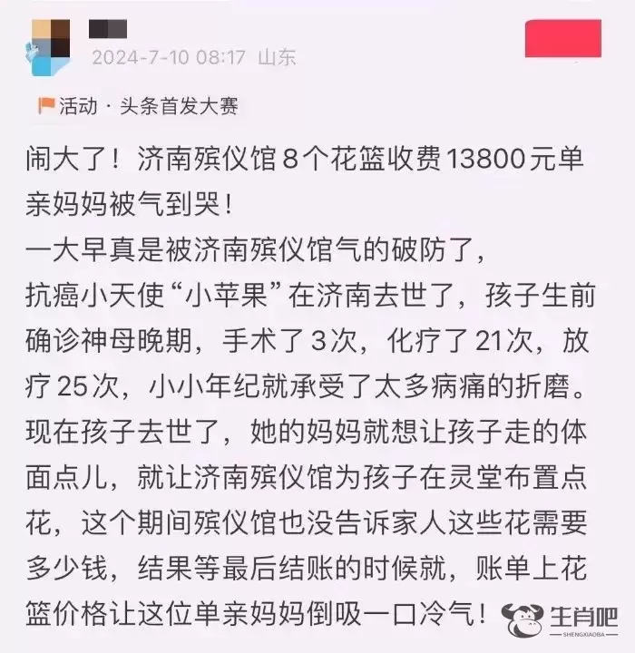 网民发文称,7月9日,4岁的抗癌小天使“小苹果”在济南去世,其妈妈想让孩子走得体面些,让济南殡仪馆为孩子在灵堂布置点花,但是8个花篮被收费13800元。