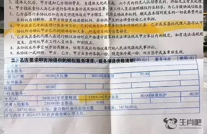 一张配图显示,双方约定于2024年7月10日在济南市殡仪馆火化,其中自选服务一栏显示守灵室鲜花标价13800元。