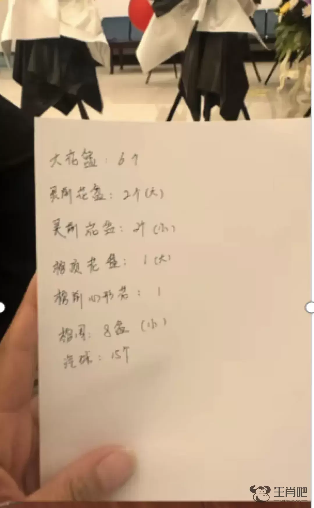 据大河报报道,视频里一份手写单据显示:大花篮6个,灵前花盆2个(大)、灵前花盆2个(小)、棺顶花盆1个(大)、棺前心形花1个、棺周8盆(小)、气球15个。