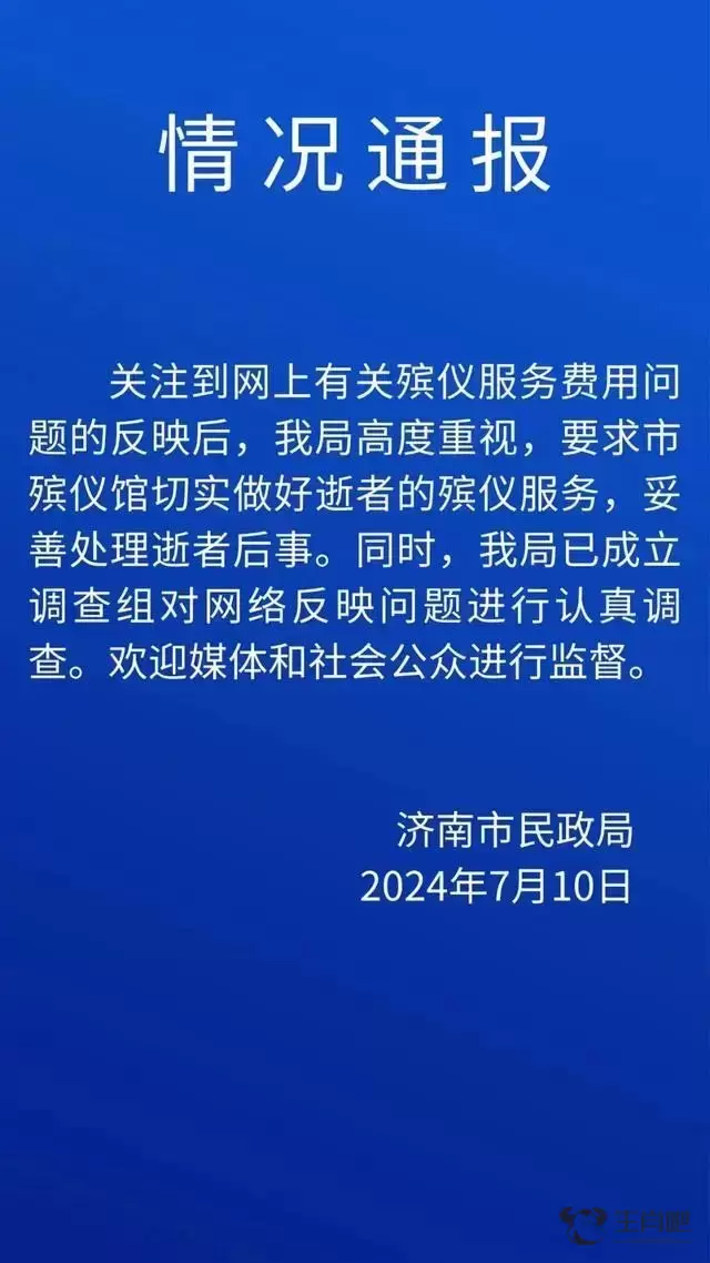 7月10日晚,济南市民政局通报,关注到网上有关殡仪服务费用问题的反映后,济南市民政局高度重视,要求市殡仪馆切实做好逝者的殡仪服务,妥善处理逝者后事。同时,济南市民政局已成立调查组对网络反映问题进行认真调查。欢迎媒体和社会公众进行监督。
