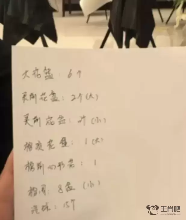他晒出了一张手写账单显示,大花篮6个,灵前花盆2大2小,棺顶花盆1个(大),棺前心形花一个,棺周8盒(小),气球15个。