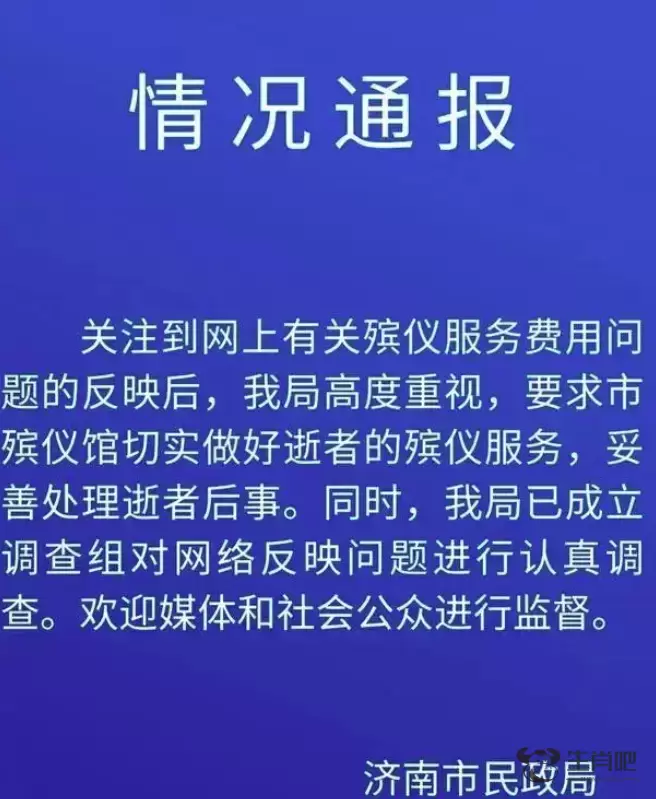 7月10日晚,济南市民政局发布通报,关注到网上有关殡仪服务费用问题的反映后,济南市民政局高度重视,要求市殡仪馆切实做好逝者的殡仪服务,妥善处理逝者后事。同时,济南市民政局已成立调查组对网络反映问题进行认真调查。欢迎媒体和社会公众进行监督。