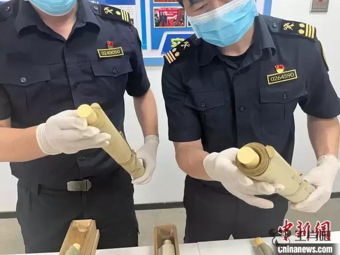 中新网天津7月11日电 (记者 王君妍)记者11日从天津海关获悉,天津邮局海关近日在进境邮件中查获象牙画轴轴头12件,目前该邮件已被海关依法予以暂扣并移交后续处置。