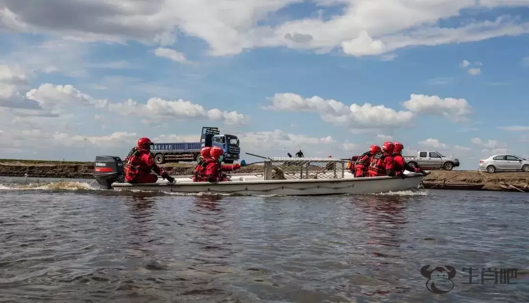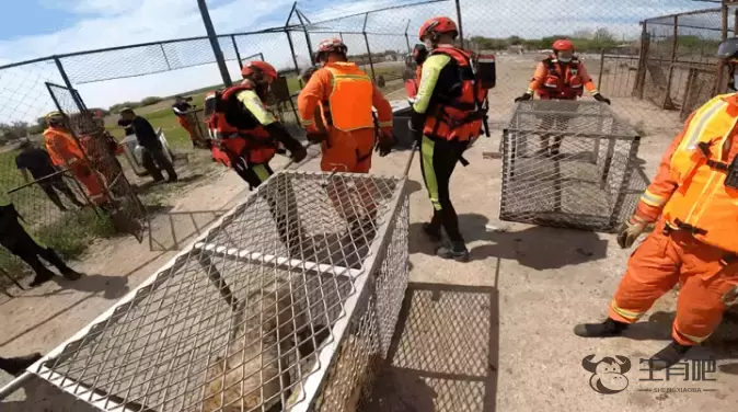 救援人员分成两个小组,第一组协助基地工作人员将狼群驱赶至笼内,并通过手抬搬运的方式将装狼的笼子转移到冲锋舟上。第二小组人员利用冲锋舟将被困狼群转移至对岸的车上并运送到安全地带。